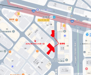 赤いところが、新規の駐車場です。スタジオからとても近いです!