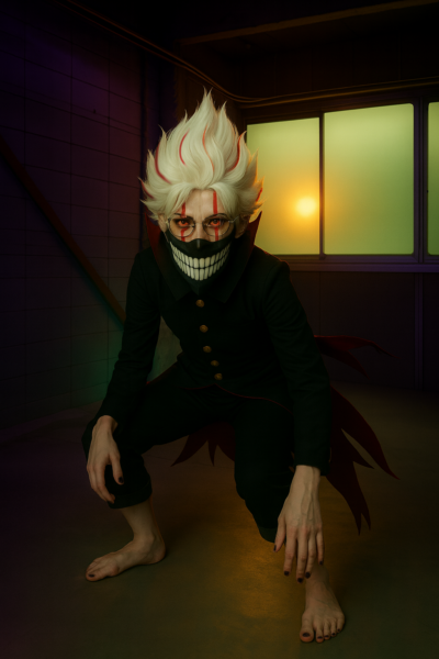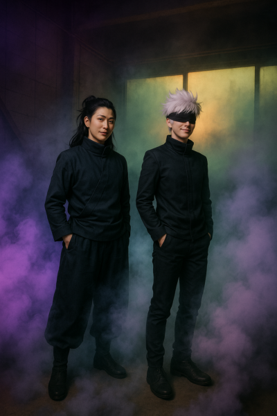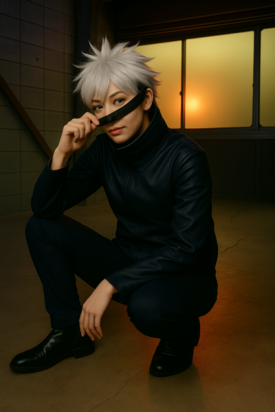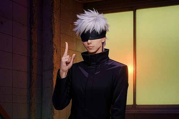 AI生成:白髪と黒の対比が映える五条悟。スタジオの逆光がいい雰囲気に。